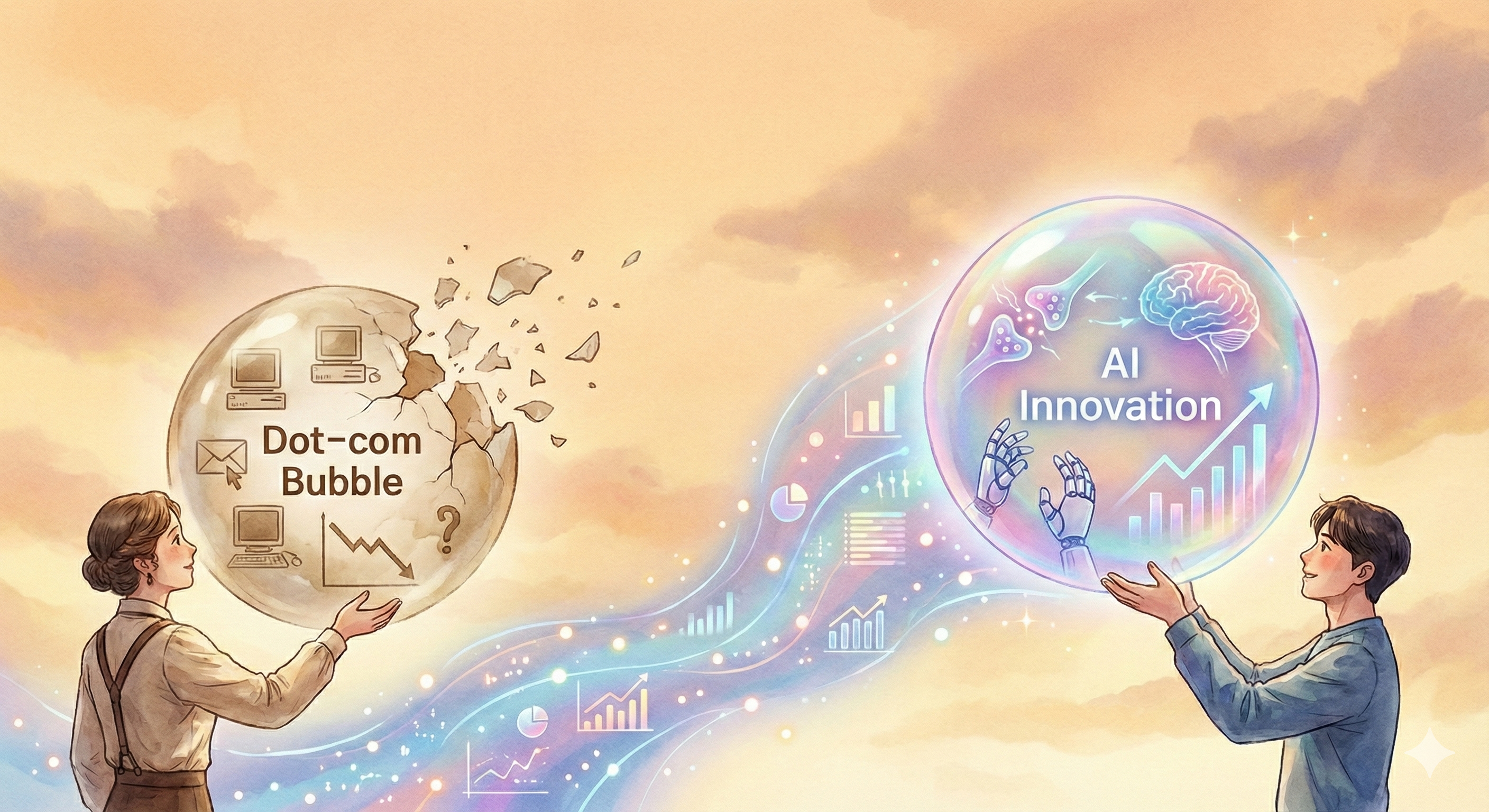 "지금이 꼭지냐, 어깨냐"를 맞추는 건 신의 영역입니다. 닷컴 버블 때도 수많은 기업이 사라졌지만, 그 시기에 태어난 아마존과 구글은 살아남아 세상을 지배했습니다. 버블이냐 아니냐보다 중요한 건 '무엇에 투자했느냐'입니다.